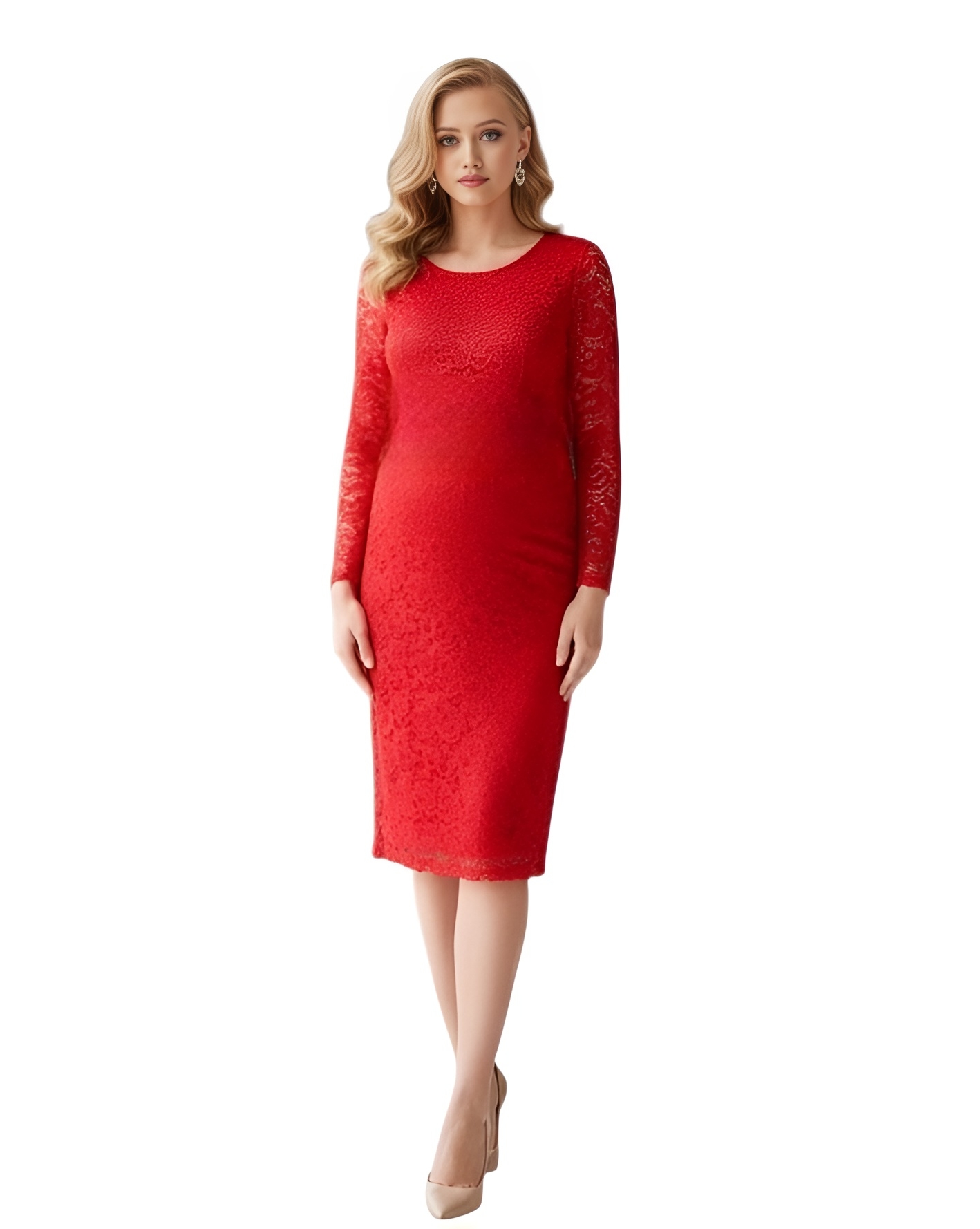 Ova haljina za trudnice crvena, dužine do koljena napravljena je od kvalitetne čipke koja joj daje visoku dozu elegancije. Haljina ima duge rukave, koji nisu pripijeni uz kožu što je odlično za žene koje ne vole uske rukave. Također, haljina ima podstavu ispod sloja čipke što Vam omogućuje bezbrižno uživanje u danu. Zahvaljujući svojoj prozračnosti, haljina je idealna za proljetna vjenčanja, ali može se nositi i u jesen i zimu.