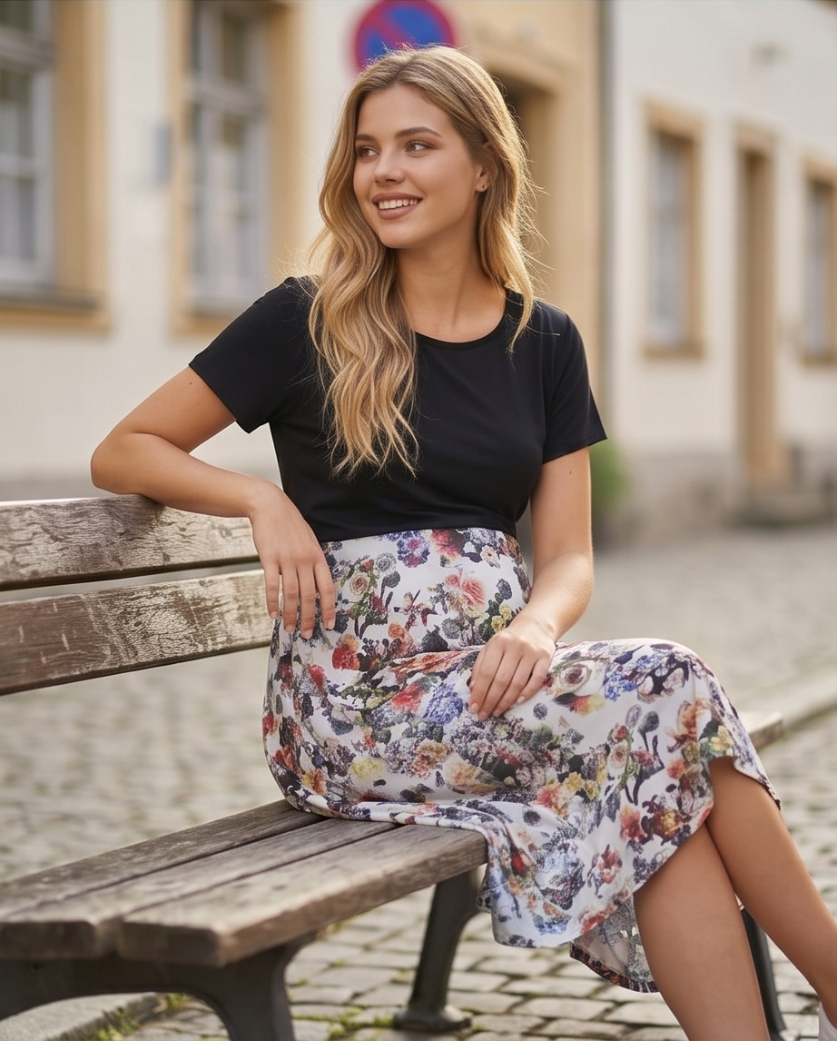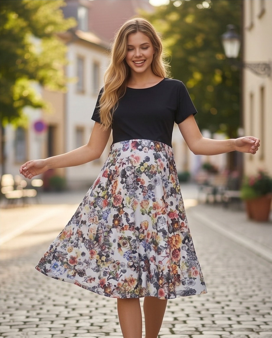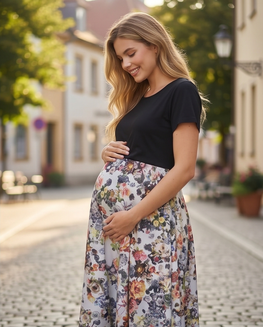 Ova trudnička haljina odiše jednostavnom elegancijom i udobnošću, savršeno prilagođenom potrebama budućih majki koje žele izgledati ženstveno i osjećati se ugodno tijekom cijelog dana. Gornji dio haljine izrađen je u klasičnoj crnoj boji, s kratkim rukavima i okruglim izrezom koji pruža minimalistički i profinjen izgled. Crni gornji dio lijepo naglašava ramena i gornji dio tijela, stvarajući skladan kontrast s donjim dijelom haljine.