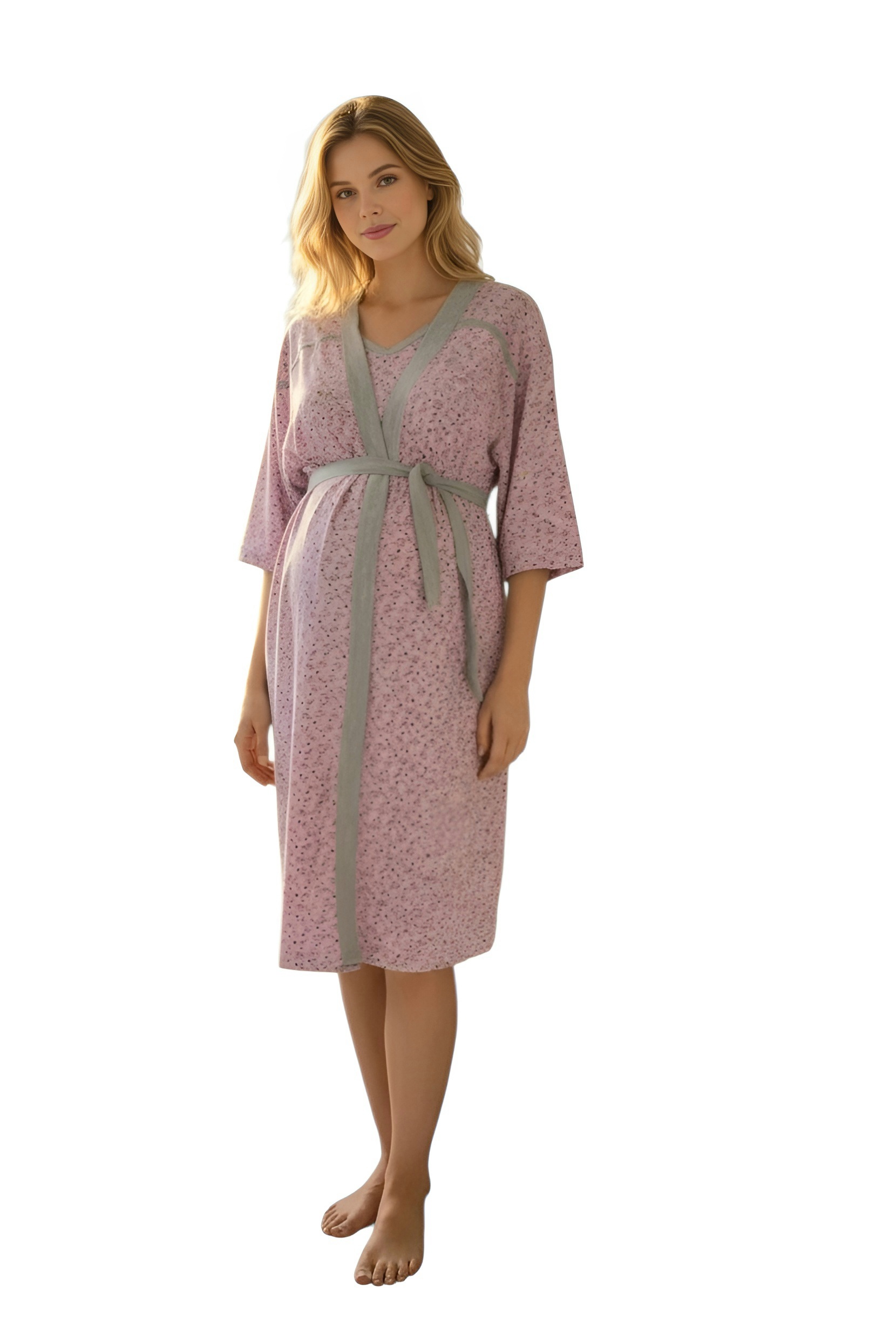 Ova trudnička spavaćica u kombinaciji s laganim ogrtačem, dizajnirana s naglaskom na udobnost i praktičnost tokom trudnoće i perioda nakon poroda. Materijal djeluje mekan i prozračan, što je idealno za osjetljivu kožu i promjene kroz koje tijelo prolazi. Boja je nježno ružičasta s diskretnim sitnim uzorkom koji daje ženstven i umirujući izgled, dok sivi detalji na rubovima i pojasu dodaju kontrast i modernu notu.