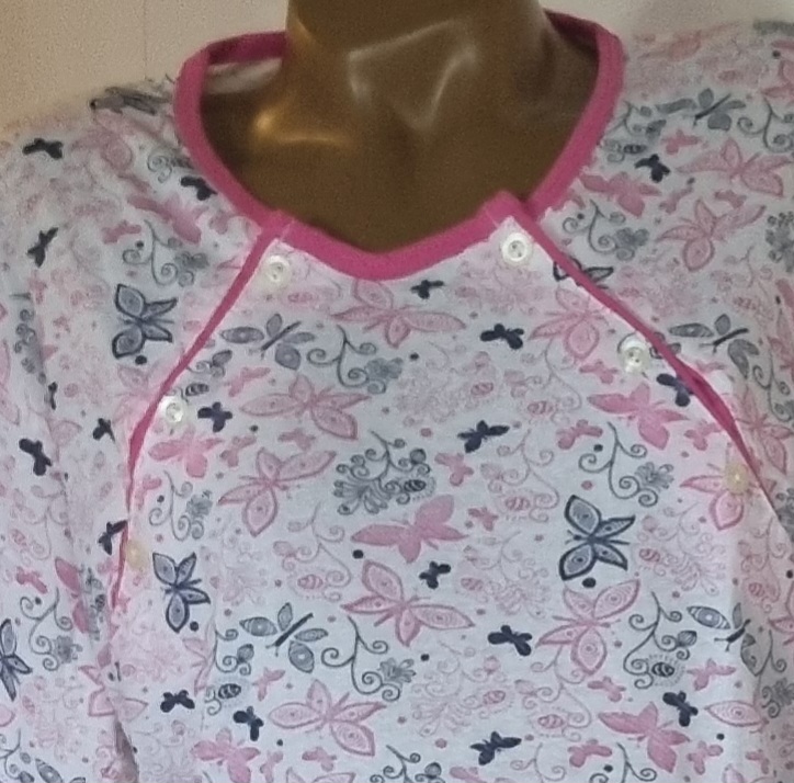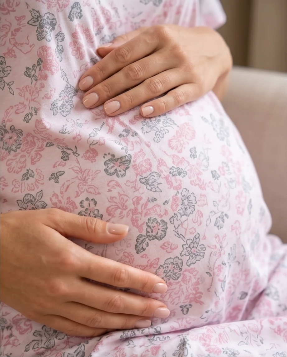 Dužina spavaćice seže do koljena, što pruža dodatnu praktičnost i osjećaj sigurnosti pri kretanju. Lagano proširen kroj prati liniju tijela bez stezanja, omogućujući trudnici da se osjeća opušteno i slobodno. Ovakav model posebno je prikladan za nošenje tijekom trudnoće, ali i nakon poroda, zahvaljujući jednostavnom i prilagodljivom dizajnu.